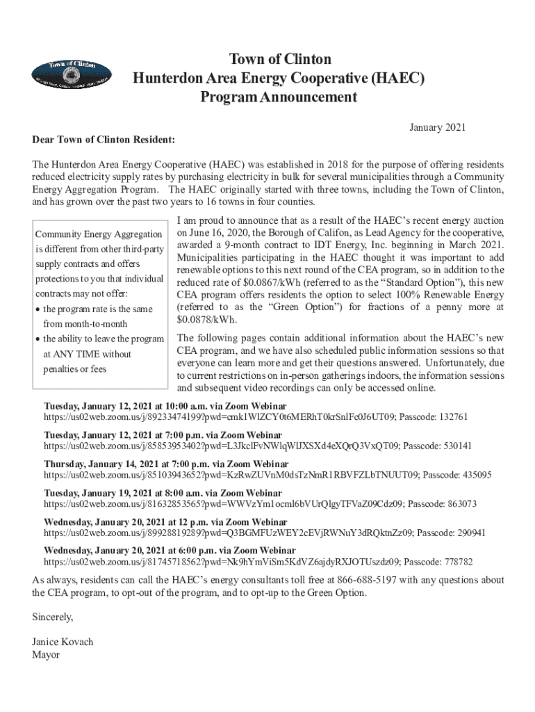Town of Clinton Hunter don Area Energy Cooperative (AEC) Program Announcement Dear Town of Clinton Resident:January 2021The Hunter don Area Energy Cooperative (AEC) was established in 2018 for the