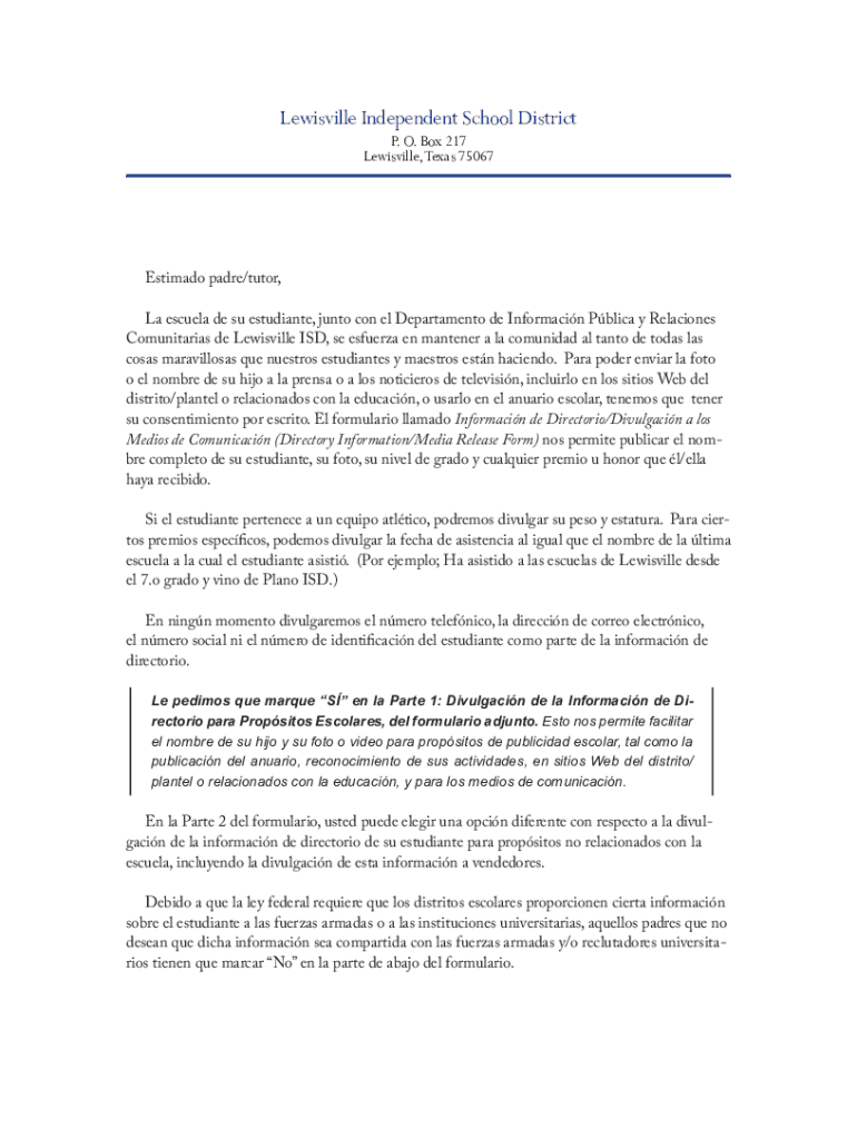 Lewisville Independent School District P. O. Box 217 Lewisville, Texas 75067Estimado padre×tutor, La Estela de SU estudiante, Junto con El Department de Informacin Public y Relations Communitarian