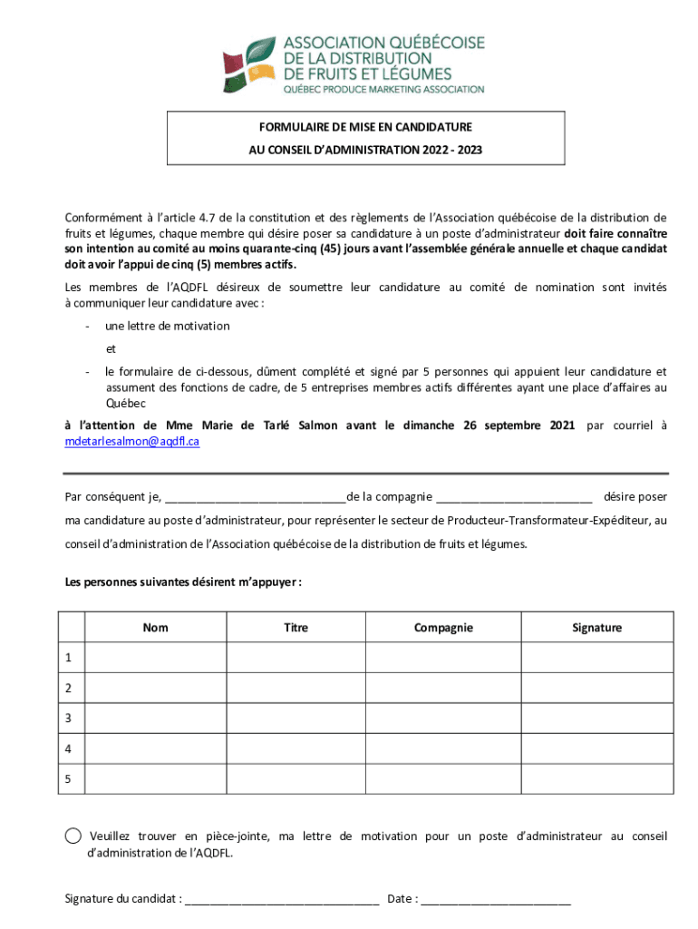 FORMULA IRE DE MILE EN CANDIDATURE AU CONSENT ADMINISTRATION 2022 2023Conformment article 4.7 DE la constitution et DES elements DE association Quebecoise de la distribution DE fruit set legumes,