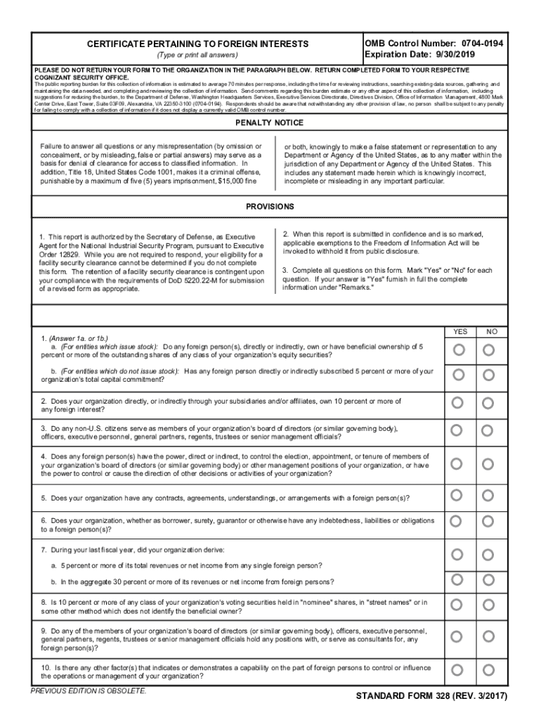Title: Standard Form 328, Certificate Pertaining to Foreign Interests, 20120501 draft Authors: WHS/ESD/IMD Created Date: 3/24/2017 2:16:38 PM