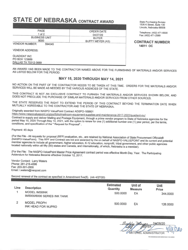 STATE OF NEBRASKA CONTRACT AWARD PAGE 2 of 2 BUSINESS UNIT9000 VENDOR NUMBER:Line 3Slate Purchasing Bureau 1526 K Street, Suite 130 Lincoln. Nebraska 68508ORDER DATETelephone: (402× 4716500 Fax: