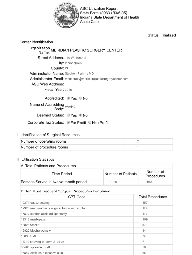ASC Utilization Report State Form 49933 (R3×605) Indiana State Department of Health Acute Care Status: Finalized I. Center Identification Organization MERIDIAN PLASTIC SURGERY CENTER Name: Street