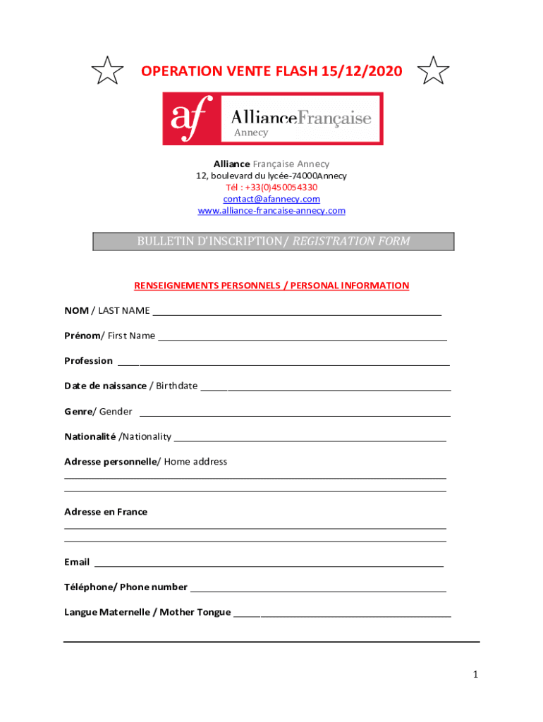 OPERATION VENUE FLASH 15×12/2020Annecy Alliance Franchise Annecy 12, boulevard Du lyce74000Annecy Tl : +33×0)450054330 contact×afannecy.com www.alliancefrancaiseannecy.comBULLETIN INSCRIPTION/