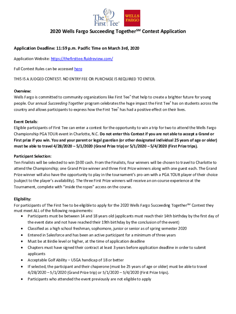 2020 Wells Fargo Succeeding Together SM Contest Application Deadline: 11:59 p.m. Pacific Time on March 3rd, 2020 Application Website: HTTPS://thefirsttee.fluidreview.com/ Full Contest Rules can be