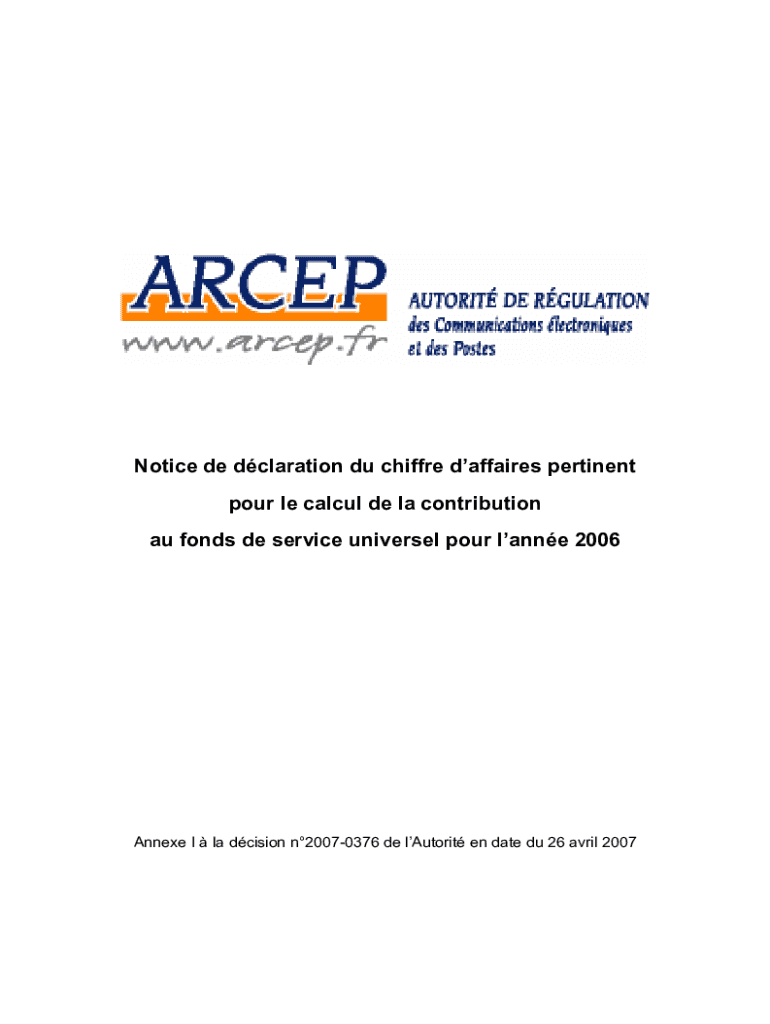 Notice DE declaration Du chiffon affairs pertinent pour LE calculi DE la contribution AU finds DE service universal pour lane 2006Annexe I la decision n20070376 de autofit en date Du 26 April 20072Notice