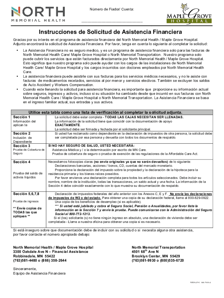 Nero de Fiador/ Cent: ___Instructions de Solicitud de Asistencia Financier Gracias POR SU inters en El program de asistencia financier Del North Memorial Health / Maple Grove Hospital. Adj unto encounter