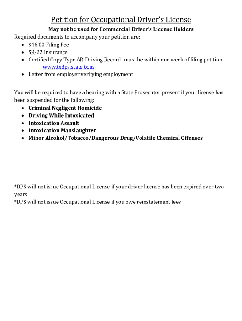 Petition for Occupational Driver's License May not be used for Commercial Driver's License Holders Required documents to accompany your petition are: $46.00 Filing Fee SR22 Insurance Certified Copy