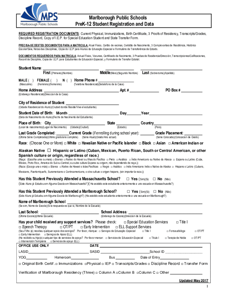 Marlborough Public Schools PreK12 Student Registration and Data REQUIRED REGISTRATION DOCUMENTS: Current Physical, Immunizations, Birth Certificate, 3 Proofs of Residency, Transcripts×Grades, Discipline