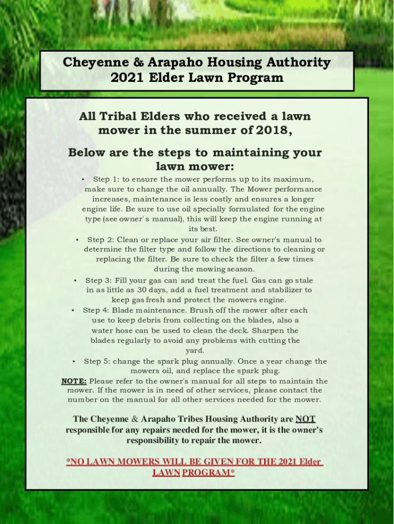 Cheyenne & Arapaho Housing Authority 2021 Elder Lawn Program All Tribal Elders who received a lawn mower in the summer of 2018, Below are the steps to maintaining your lawn mower: Step 1: to ensure