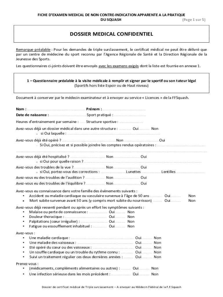 FICHE DEXA MEN MEDICAL DE NON CONTRAINDICATION APPARENT À la CRITIQUE DU SQUASH (Page 1 SUR 5×DOSSIER MEDICAL CONFIDENTIAL Remarque probable : Pour LES demands DE triple surclassement, LE certificate