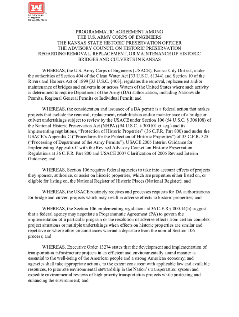 PROGRAMMATIC AGREEMENT AMONG THE U.S. ARMY CORPS OF ENGINEERS THE KANSAS STATE HISTORIC PRESERVATION OFFICER THE ADVISORY COUNCIL ON HISTORIC PRESERVATION REGARDING REMOVAL, REPLACEMENT, OR MAINTENANCE