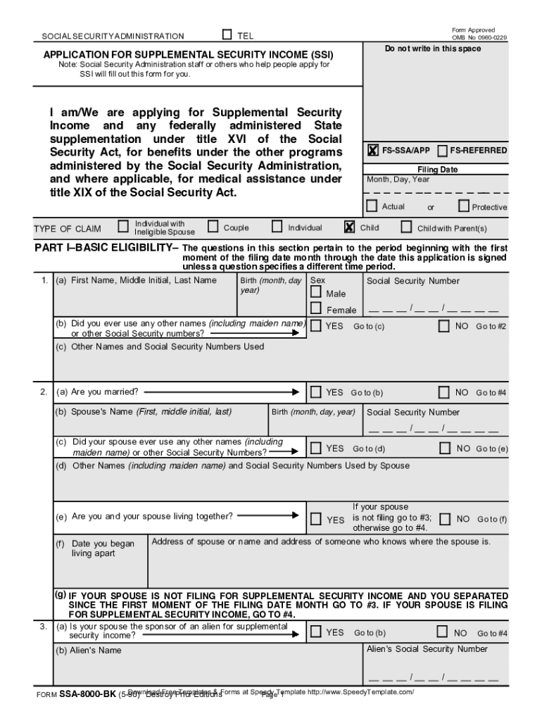 Form Approved OMB No 09600229TELSOCIAL SECURITY Administration not write in this spaceAPPLICATION FOR SUPPLEMENTAL SECURITY INCOME (SSI) Note: Social Security Administration staff or others who help