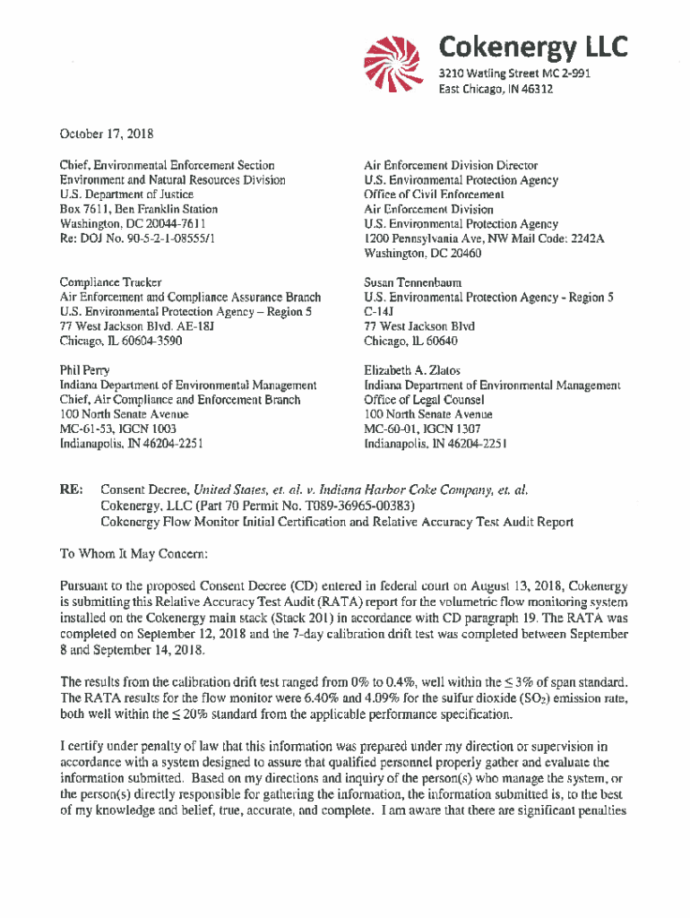 CONTINUOUSEMISSIONSMONITORINGSYSTEMRELATIVEACCURACY DETERMINATIONANDCERTIFICATIONTESTPerformedAtPrimaryEnergy CokenergyFacility HRCCStack201 East Chicago, Indiana TestDatesSeptember12,2018×DATA)