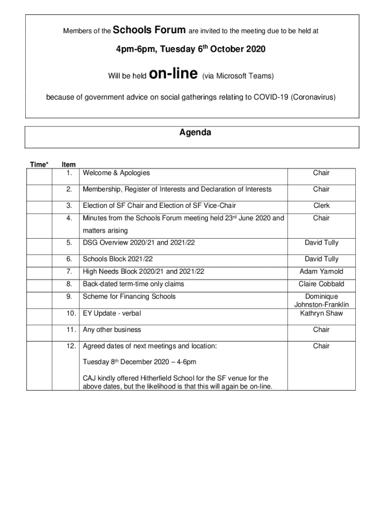 Members of the SchoolsForum are invited to the meeting due to be held at4pm6pm, Tuesday 6th October 2020 Will be held online (via Microsoft Teams×because of government advice on social gatherings