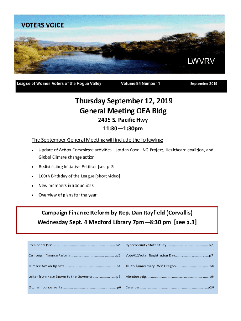 VOTERS VOICELWVRV League of Women Voters of the Rogue ValleyVolume 84 Number 1September 2019Thursday September 12, 2019, General Meeting OEA Bldg 2495 S. Pacific Hwy 11:301:30pm The September General