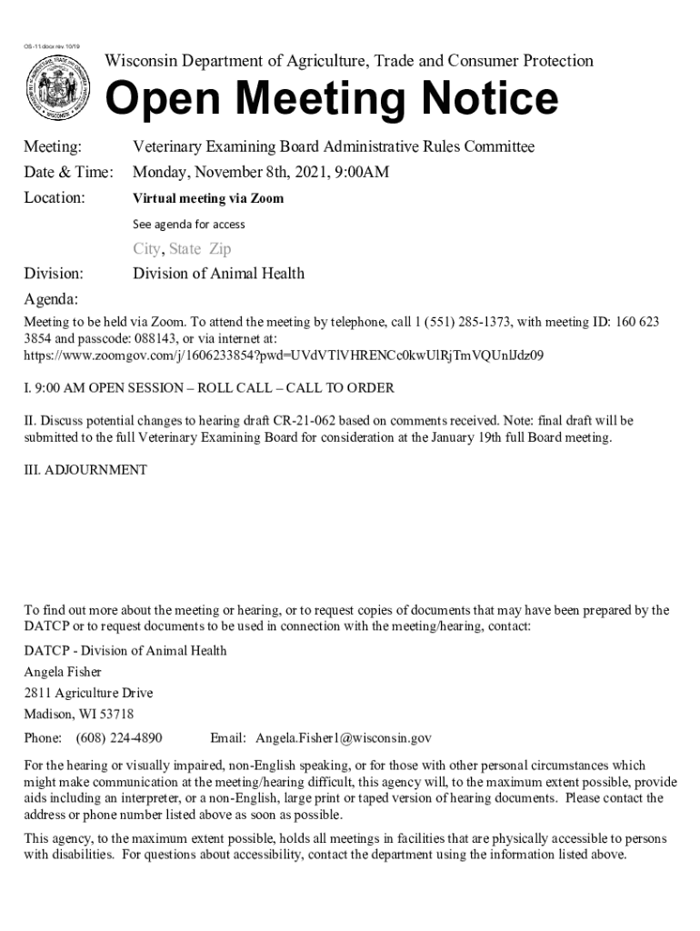 OS11.docx rev.10×19Wisconsin Department of Agriculture, Trade and Consumer ProtectionOpen Meeting Notice Meeting:Veterinary Examining Board Administrative Rules Committeeman & Time:Monday, November