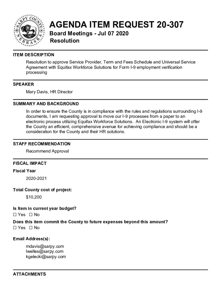 AGENDA ITEM REQUEST 20307 Board Meetings Jul 07 2020 Resolution ITEM DESCRIPTION Resolution to approve Service Provider, Term and Fees Schedule and Universal Service Agreement with Equifax Workforce