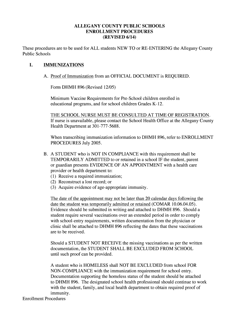 ALLEGING COUNTY PUBLIC SCHOOLS ENROLLMENT PROCEDURES (REVISED 6/14) These procedures are to be used for ALL students NEW TO or REENTERING the Alleging County Public Schools I. IMMUNIZATIONS A. Proof
