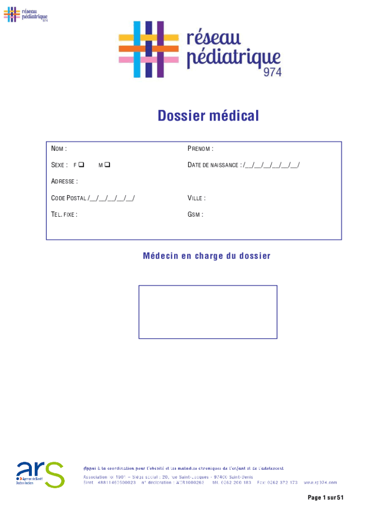 Dossier medical NOT : SEE : F PHENOM : DATE DE RENAISSANCE : /__/__/__/__/__/__/ADDRESS : CODE POSTAL /__/__/__/__/__/VILLA :TEL. FINE :GSM :Devin en charge Du dossier Page 1 SUR 51ENQUETE NUTRITIONALLY