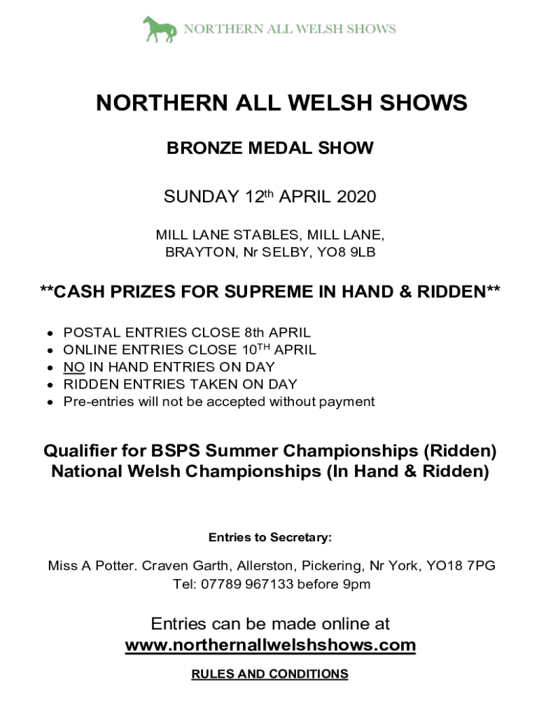 NORTHERN ALL WELSH SHOWS BRONZE MEDAL SHOW SUNDAY 12th APRIL 2020 MILL LANE STABLES, MILL LANE, BRAXTON, NR SHELBY, YO8 9LB**CASH PRIZES FOR SUPREME IN HAND & RIDDEN** POSTAL ENTRIES CLOSE 8th APRIL