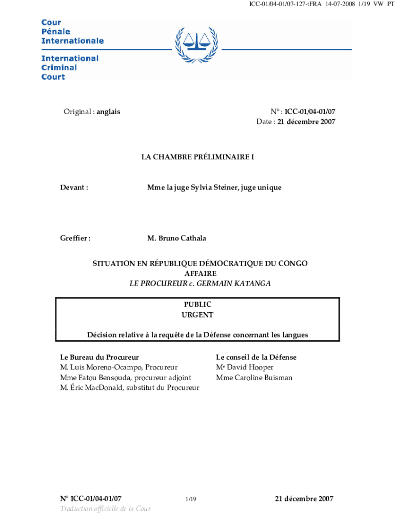 ICC01×0401/07127tFRA 14072008 1×19 VW PT Original:angriest:ICC01×0401×07 Date:21dcembre2007 LACHAMBREPRLIMINAIREI Levant: MmelajugeSylviaSteiner, jugeunique Gruffer’M. BrunoCathalaSITUATIONENRPUBLIQUEDMOCRATIQUEDUCONGO