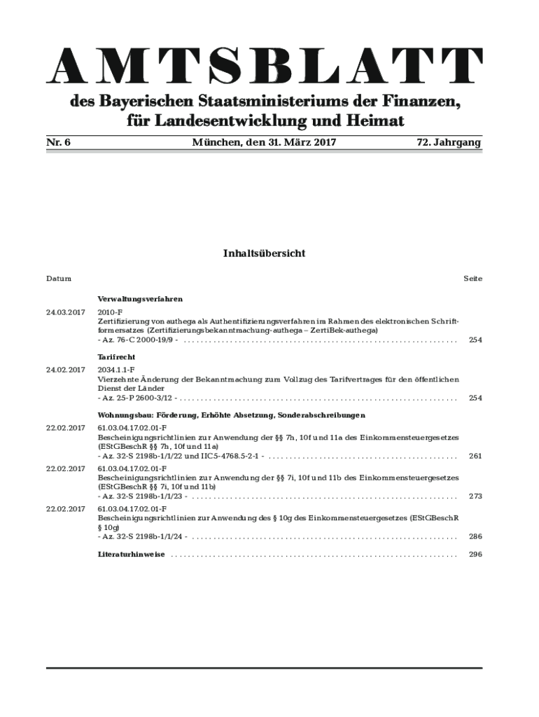 An M T SL AT T DES Bayerischen Staatsministeriums her Finance, for Landesentwicklung UND Hamster.6Mnchen, den 31. Mr 201772. JahrgangInhaltsbersicht Datum SeiteVerwaltungsverfahren24.03.2017 2010F