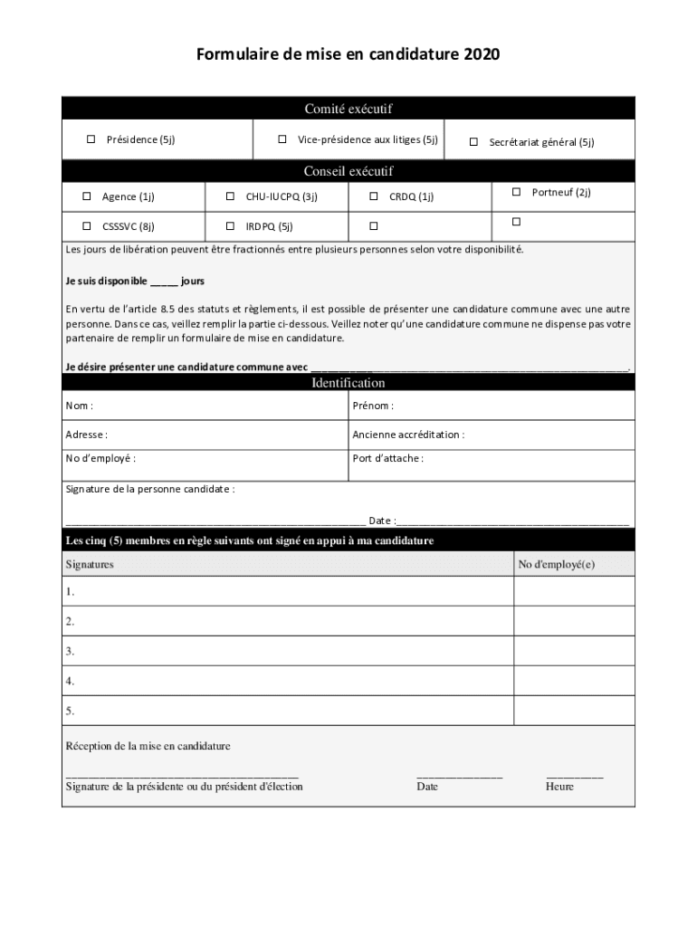 Formula ire demise en candidature 2020 Comic executed Residence (5j) Viceprsidence aux cities (5j) Secretariat gnarl (5j×Conrail executed Agency (1j) CHUIUCPQ (3j) CRAQ (1j) Partner (2j) CSS SVC