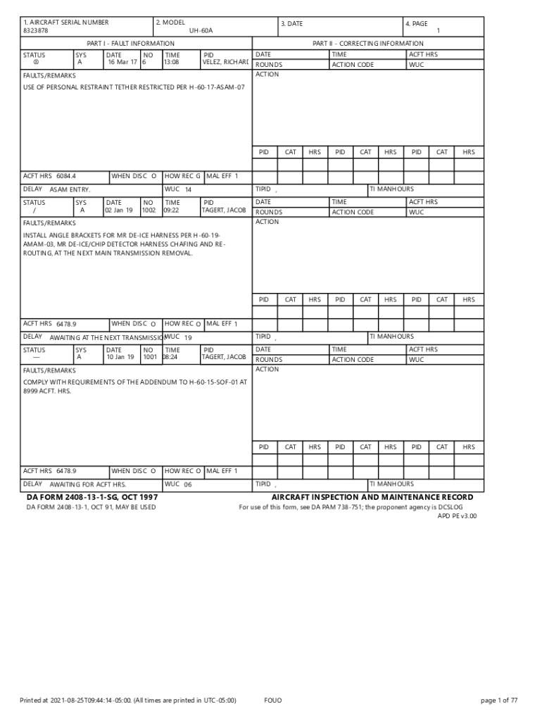 1. AIRCRAFT SERIAL NUMBER 83238782. MODEL3. DATEUH60APART I FAULT INFORMATION STATUS SAYS DATE NO 16 Mar 17 6TIME 13:08FAULTS×REMARKS4. PAGE1PART II CORRECTING INFORMATION DATE PID VELEZ, RICHARD
