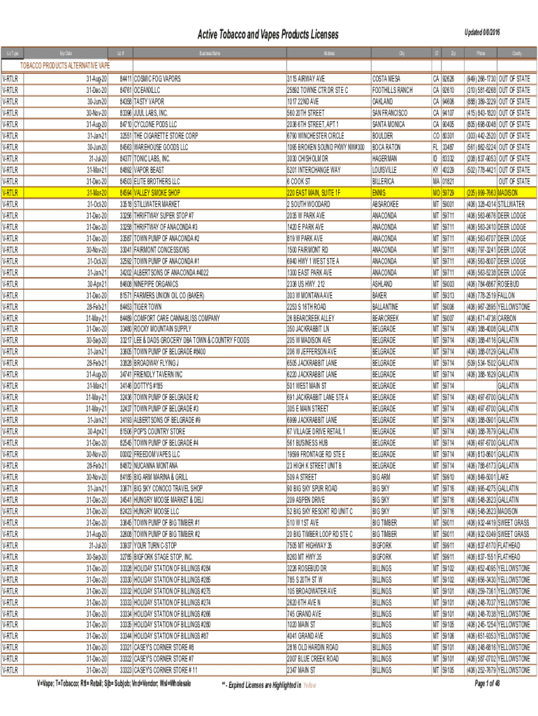 Active Tobacco and Vapes Products Licenses LIC Typewriter VOTER VOTER VOTER VRTLRExp Gaelic #Business NameAddressTOBACCO PRODUCTS ALTERNATIVE VAPE 31Aug20 84411