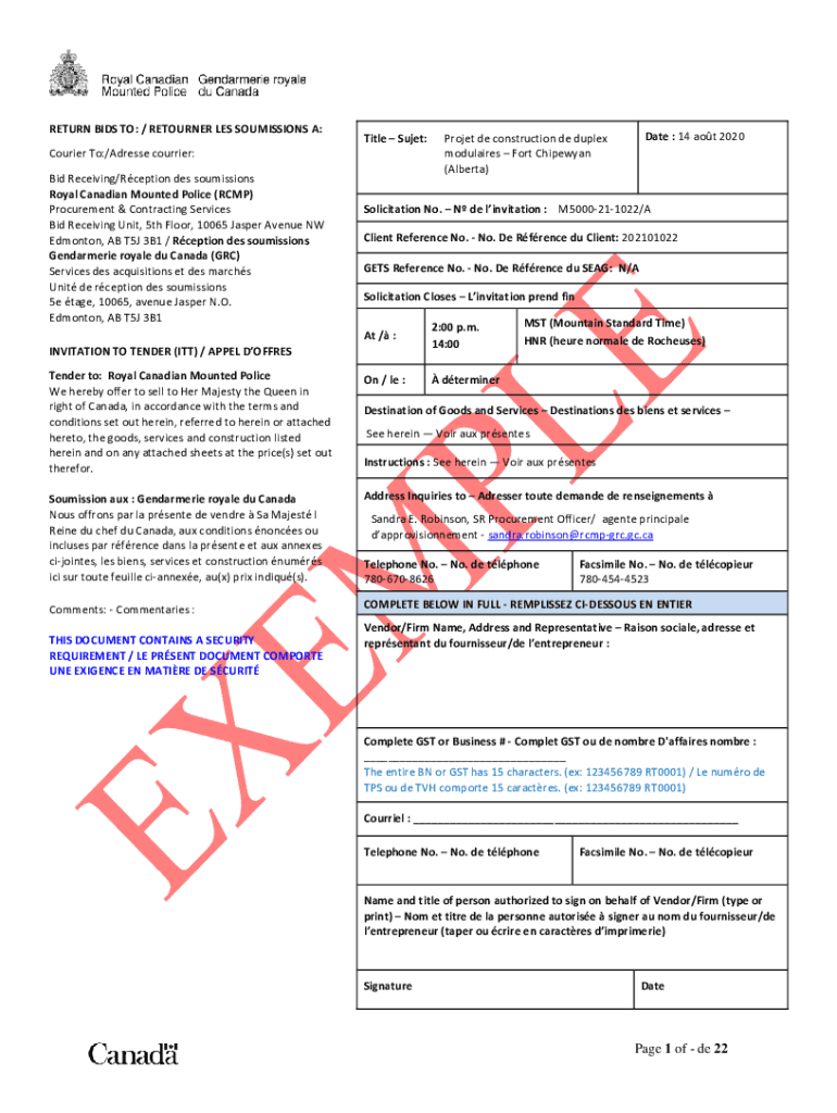 RETURN BIDS TO: / RETURNER LES COMMISSIONS A: Courier To:/Address courier: Bid Receiving×Reception DES sou missions Royal Canadian Mounted Police (RCMP) Procurement & Contracting Services Bid Receiving