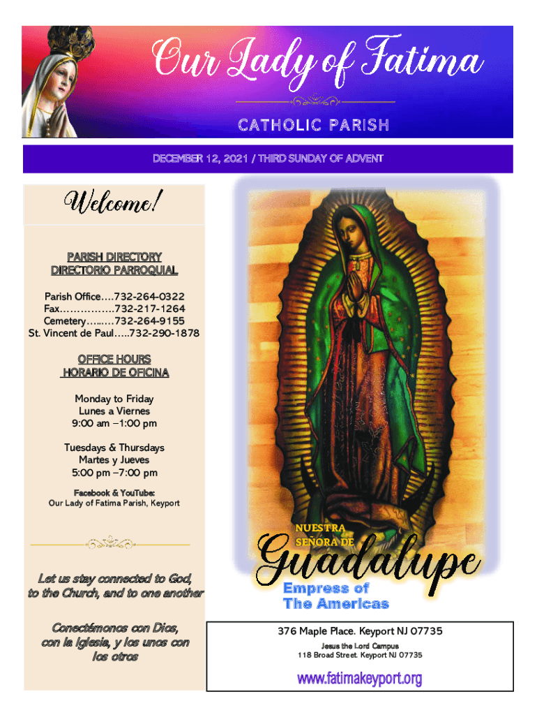 CATHOLIC PARISH DECEMBER 12, 2021 / THIRD SUNDAY OF ADVENTURISM DIRECTORY DIRECTOR PAROCHIAL Parish Office.7322640322 Fax.7322171264 Cemetery...7322649155 St. Vincent de Paul.7322901878OFFICE HOURS
