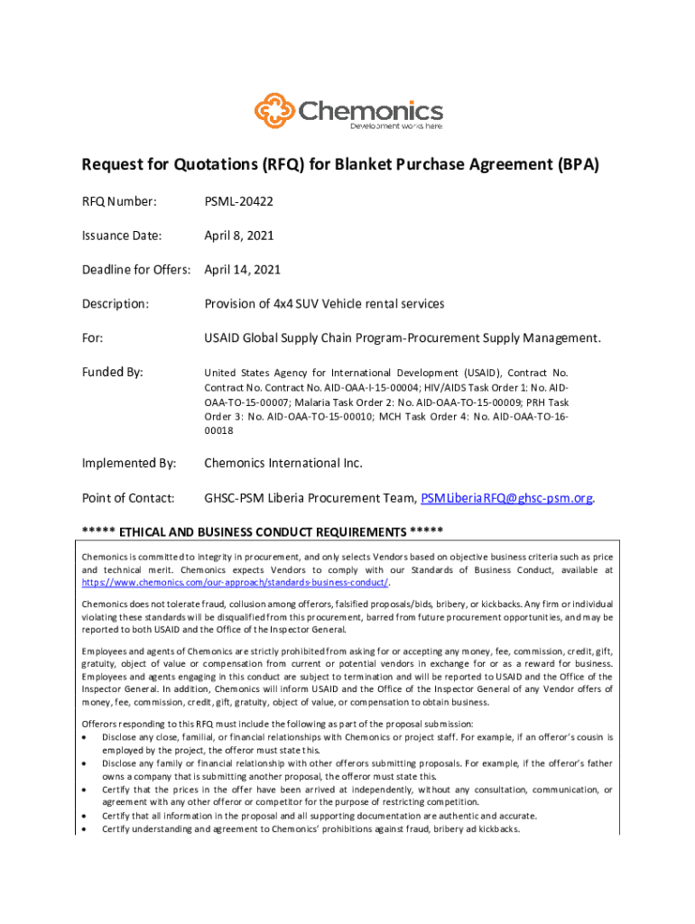 Request for Quotations (RFQ) for Blanket Purchase Agreement (BPA) RFQ Number:PSML20422Issuance Date:April 8, 2021Deadline for Offers: April 14, 2022, Description:Provision of 4×4 SUV Vehicle rental