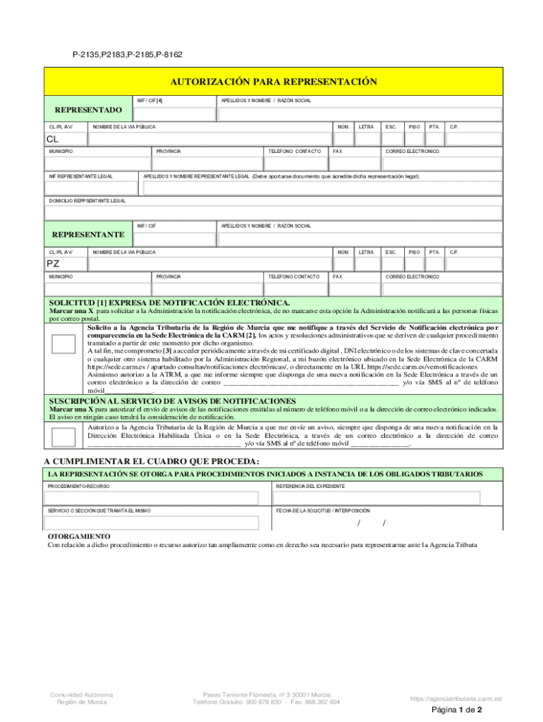 Region de Murcia Consider DE Hacienda P2135,P2183,P2185,P8162ImprimirAUTORIZACIN PARA REPRESENTACINLimpiar formulation NIF / CIF [4×SPELLINGS Y HOMBRE / RAN SOCIALREPRESENTADO CL /PL /AV×HOMBRE
