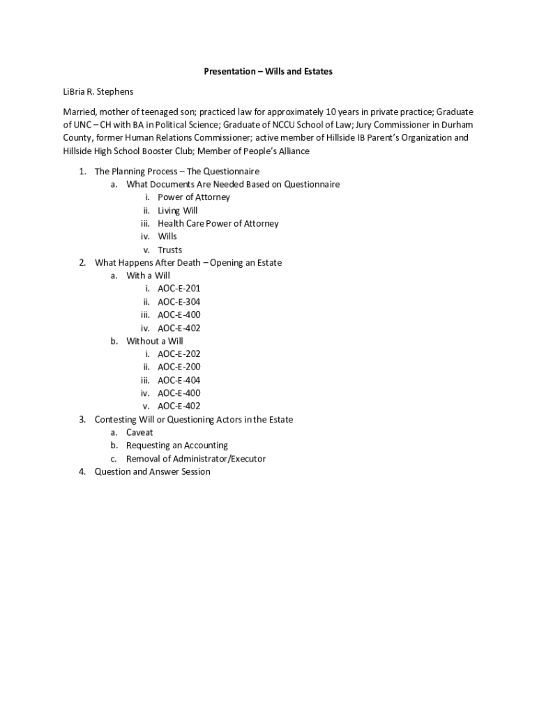 Presentation Wills and Estates Liberia R. Stephens Married, mother of teenaged son; practiced law for approximately 10 years in private practice; Graduate of UNC CH with BA in Political Science; Graduate