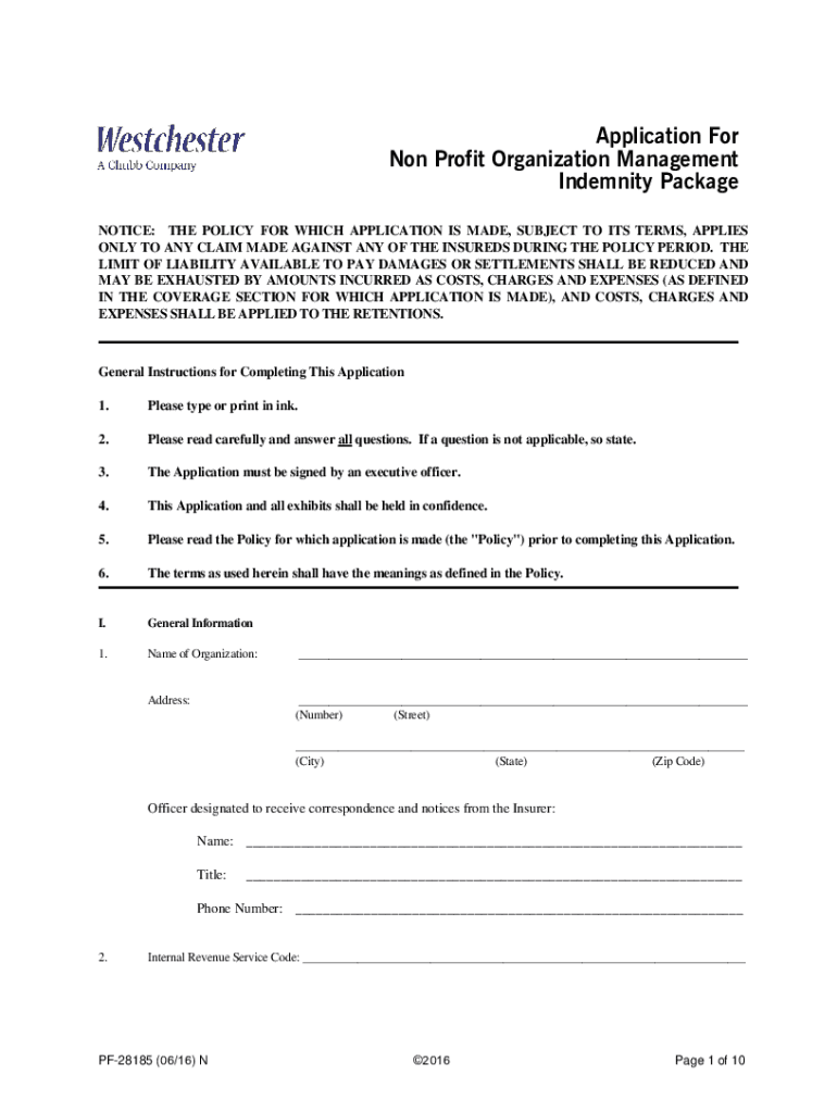 Application For Non Profit Organization Management Indemnity Package NOTICE: THE POLICY FOR WHICH APPLICATION IS MADE, SUBJECT TO ITS TERMS, APPLIES ONLY TO ANY CLAIM MADE AGAINST ANY OF THE INSUREDS