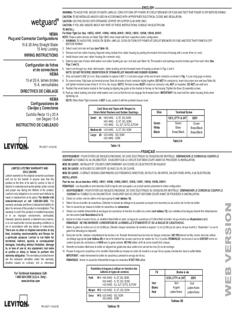 ENGLISHNESS Plug and Connector Conjurations 15 & 20 Amp Straight Blade 15 Amp Locking WIRING INSTRUCTIONS Conjuration DE chest et de connectors NEA 15 ET 20 A, lames routes 15 A, verrouillables DIRECTIVES