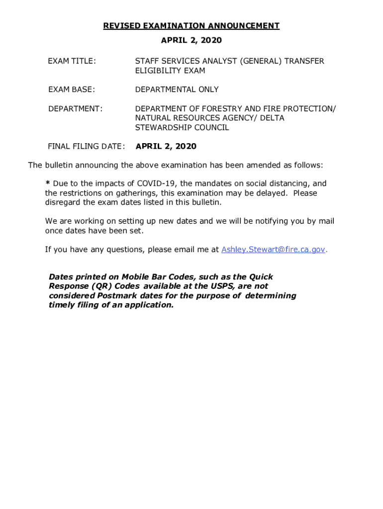 REVISED EXAMINATION ANNOUNCEMENT APRIL 2, 2020, EXAM TITLE:STAFF SERVICES ANALYST (GENERAL) TRANSFER ELIGIBILITY EXAGRAM BASE:DEPARTMENTAL ONLYDEPARTMENT:DEPARTMENT OF FORESTRY AND FIRE PROTECTION/