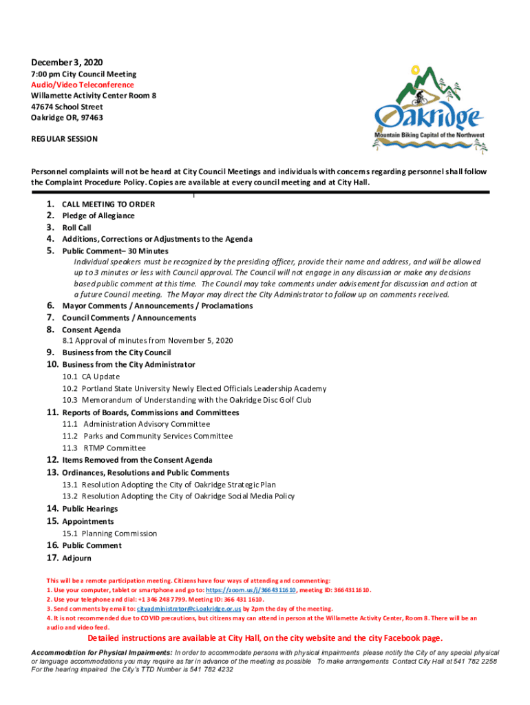 December 3, 20207:00 pm City Council Meeting Audio×Video Teleconference Willamette Activity Center Room 8 47674 School Street Oak ridge OR, 97463 REGULAR SESSION Personnel complaints will not be