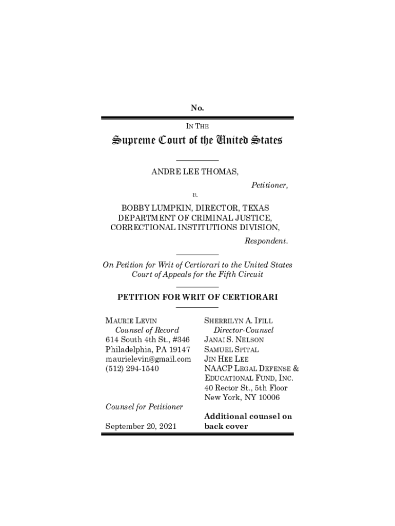 No. IN Supreme Court of the United States ___ ANDRE LEE THOMAS, Petitioner, v. BOBBY LUMPKIN, DIRECTOR, TEXAS DEPARTMENT OF CRIMINAL JUSTICE, CORRECTIONAL INSTITUTIONS DIVISION, Respondent. ___ On