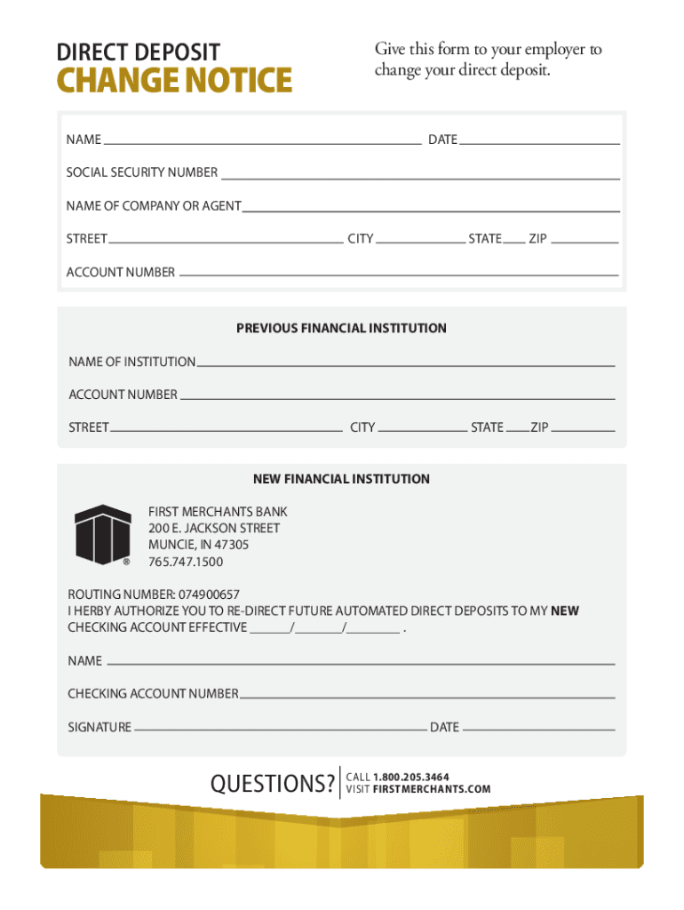 DIRECT DEPOSITCHANGE noticeable this form to your employer to change your direct deposit.NAMEDATESOCIAL SECURITY NUMBER NAME OF COMPANY OR AGENT STREETCITYSTATEZIPSTATEZIPACCOUNT NUMBERPREVIOUS FINANCIAL