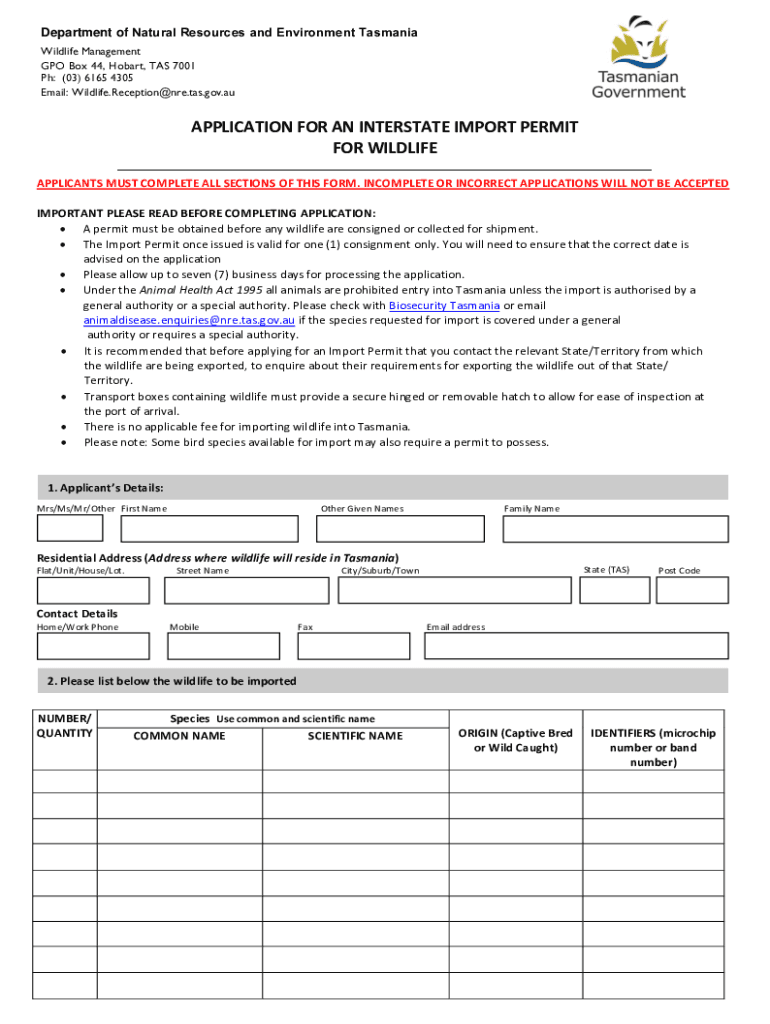 Department of Natural Resources and Environment Tasmania Wildlife Management GPO Box 44, Hobart, TAS 7001 pH: (03× 6165 4305 Email: Wildlife. Reception@are.TAS.gov.application FOR AN INTERSTATE IMPORT