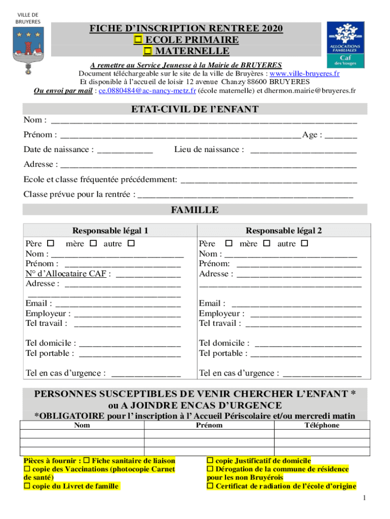FICHE INSCRIPTION Entrée 2020 COLE PRIMARY MATERNALLY A resettled AU Service Tennessee la Masai de BRUYERES Document rechargeable SUR LE site DE la Villa de Buyers : www.villebruyeres.fr Et disposable