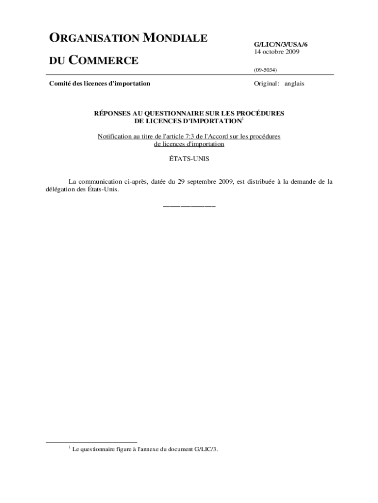 Organization MONDALE DU COMMERCE×LIC×N/3×USA×6 14 October 2009 ×095034)Original: anglaisComit DES licenses d\'importationRPONSES AU QUESTIONNAIRE SUR LES PROCEDURES DE Licenses D\'IMPORTATION1