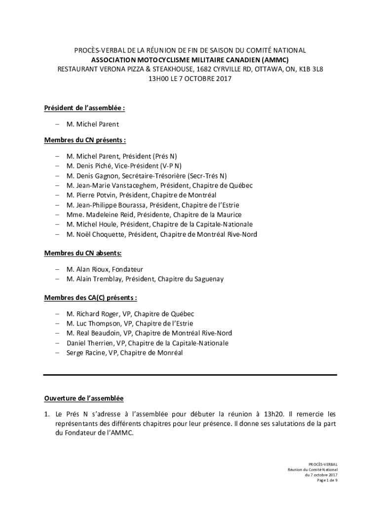 PROCÈS-VERBAL DE LAR UNION DE FIN DE SAIGON DU COMIC NATIONALASSOCIATION MOTORCYCLIST MILITARY CANADIAN (AMMO×RESTAURANT VERONA PIZZA & STEAKHOUSE, 1682 ORVILLE RD, OTTAWA, ON, K1B 3L813H00 LE 7