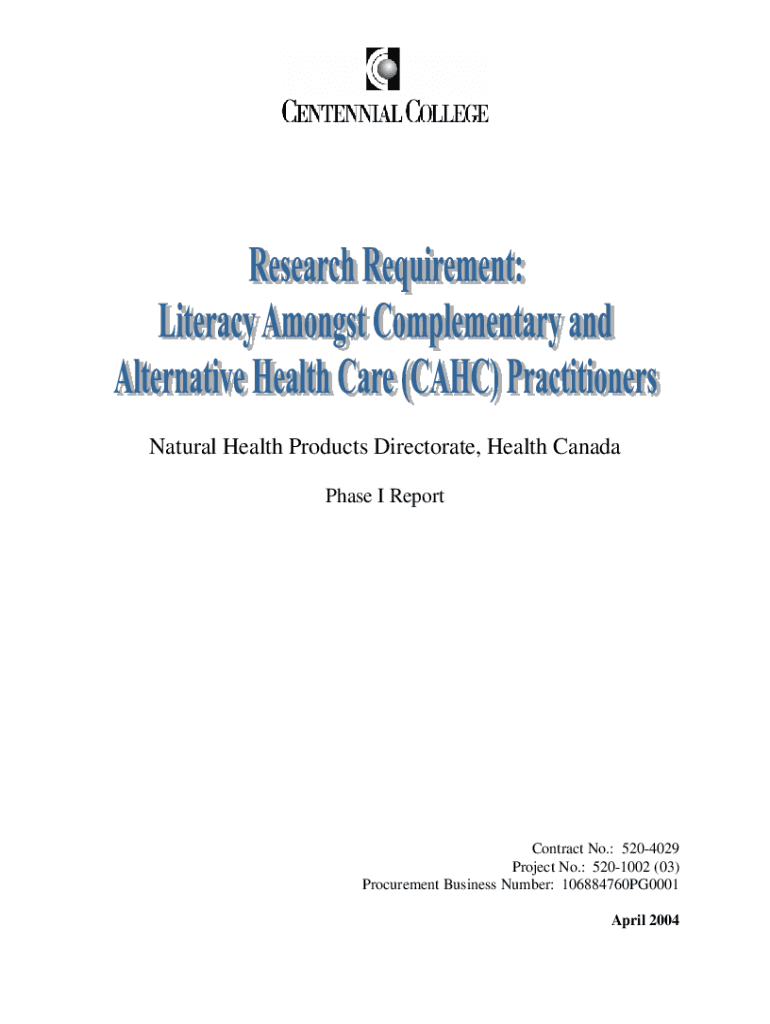 Natural Health Products Directorate, Health Canada Phase I ReportContract No.: 5204029 Project No.: 5201002 ×03) Procurement Business Number: 106884760PG0001 April 2004Acknowledgements:The research