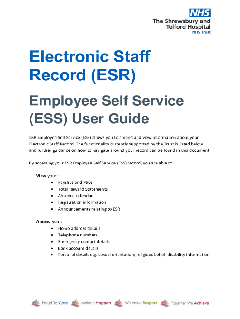 Electronic Staff Record (ESR) Employee Self Service (ESS) User Guide ESR Employee Self Service (ESS) allows you to amend and view information about your Electronic Staff Record. The functionality