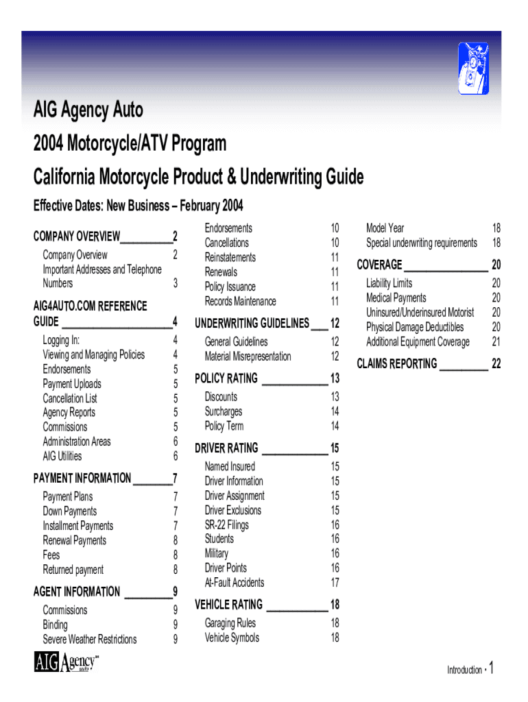 AIG Agency Auto 2004 Motorcycle×ATV Program California Motorcycle Product & Underwriting Guide Effective Dates: New Business February 2004 COMPANY OVERVIEW___2 Company Overview Important Addresses
