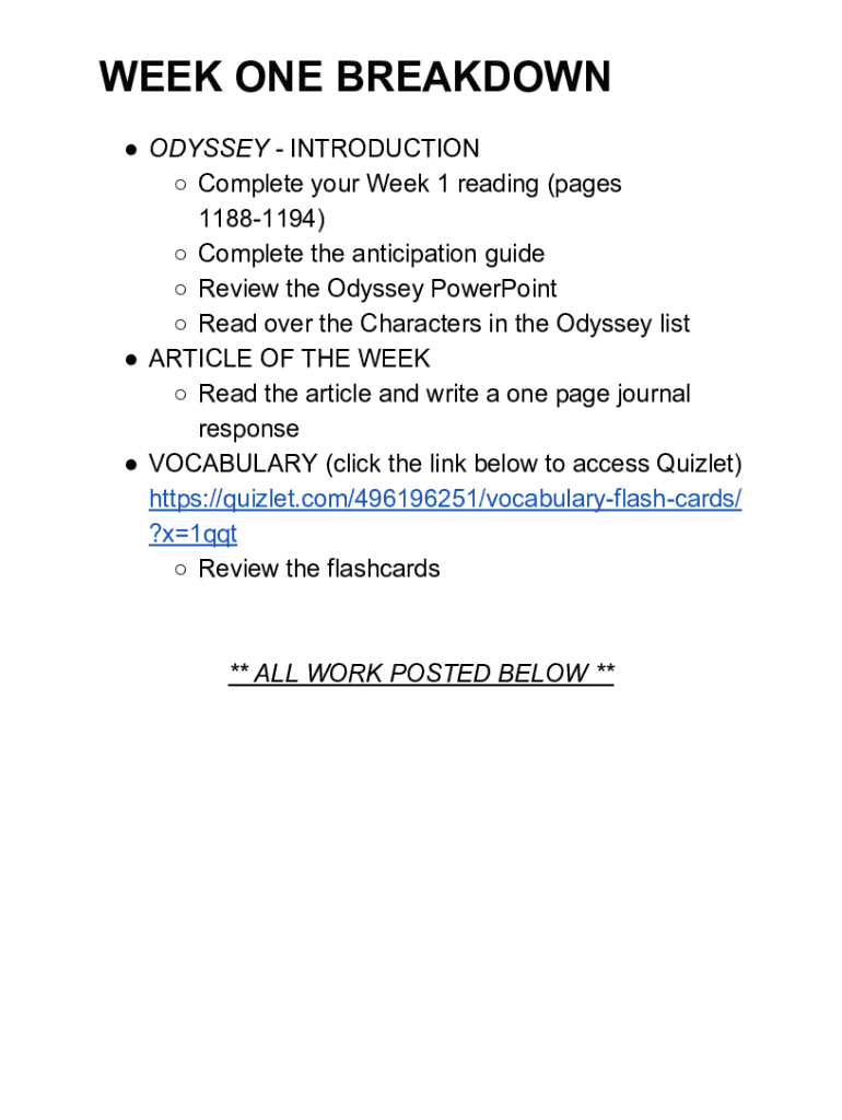 WEEK ONE BREAKDOWN ODYSSEY INTRODUCTION Complete your Week 1 reading (pages 11881194) Complete the anticipation guide Review the Odyssey PowerPoint Read over the Characters in the Odyssey list ARTICLE