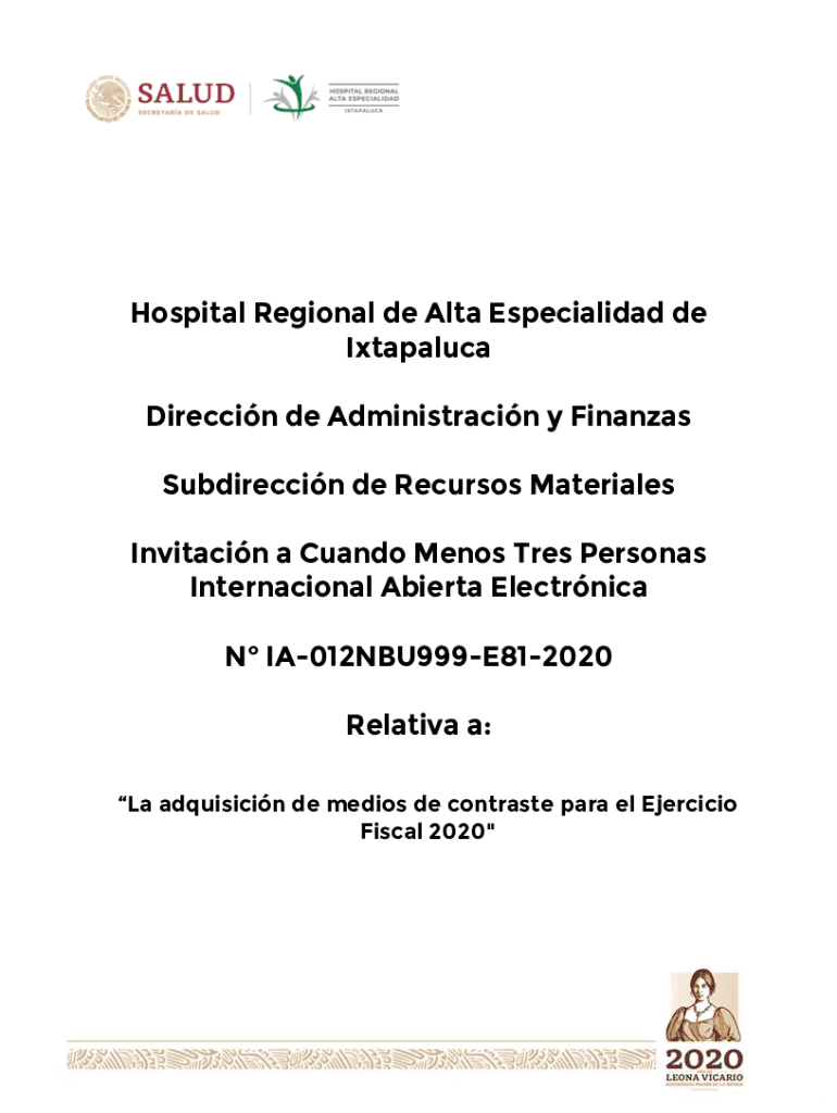 Hospital Regional de Alta Specialized de Ixtapaluca Direction de Administracin y Finances Subdireccin de Recursos Materials Invitation a Candy Menus Tree Personas International Alberta Electronica