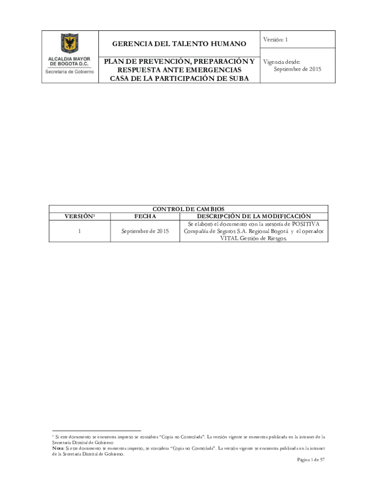 PERENNIAL DEL TALENT HUMAN PLAN DE PREVENTING, PREPARATION Y REQUEST ANTE EMERGENCIES CASA DE LA PARTICIPATING DE SUBAVERSIN1 1Versin: 1 Valencia DESE: September de 2015CONTROL DE CAM BIOS FEC HA
